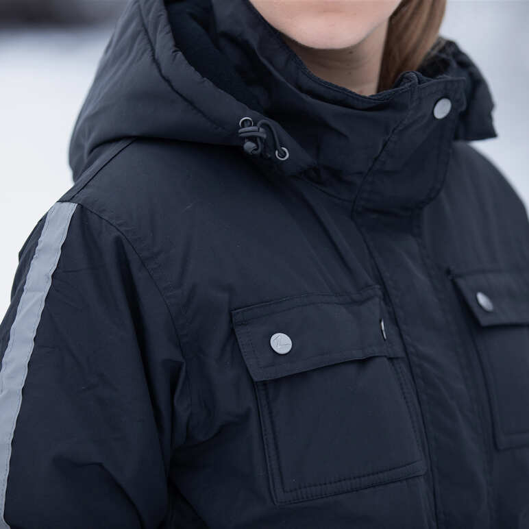 Ciepła, zimowa kurtka z odpinanym na zatrzaski kapturem. Odblaskowa taśma wzdłuż obu rękawów. Sznurek do regulacji talii i kaptura. Długi suwak z zatrzaskami. Z przodu dwie kieszenie, każda z dwoma zatrzaskami. Kieszenie na piersiach. Kieszeń na suwak po wewnętrznej stronie. Krótkie zamki po bokach.